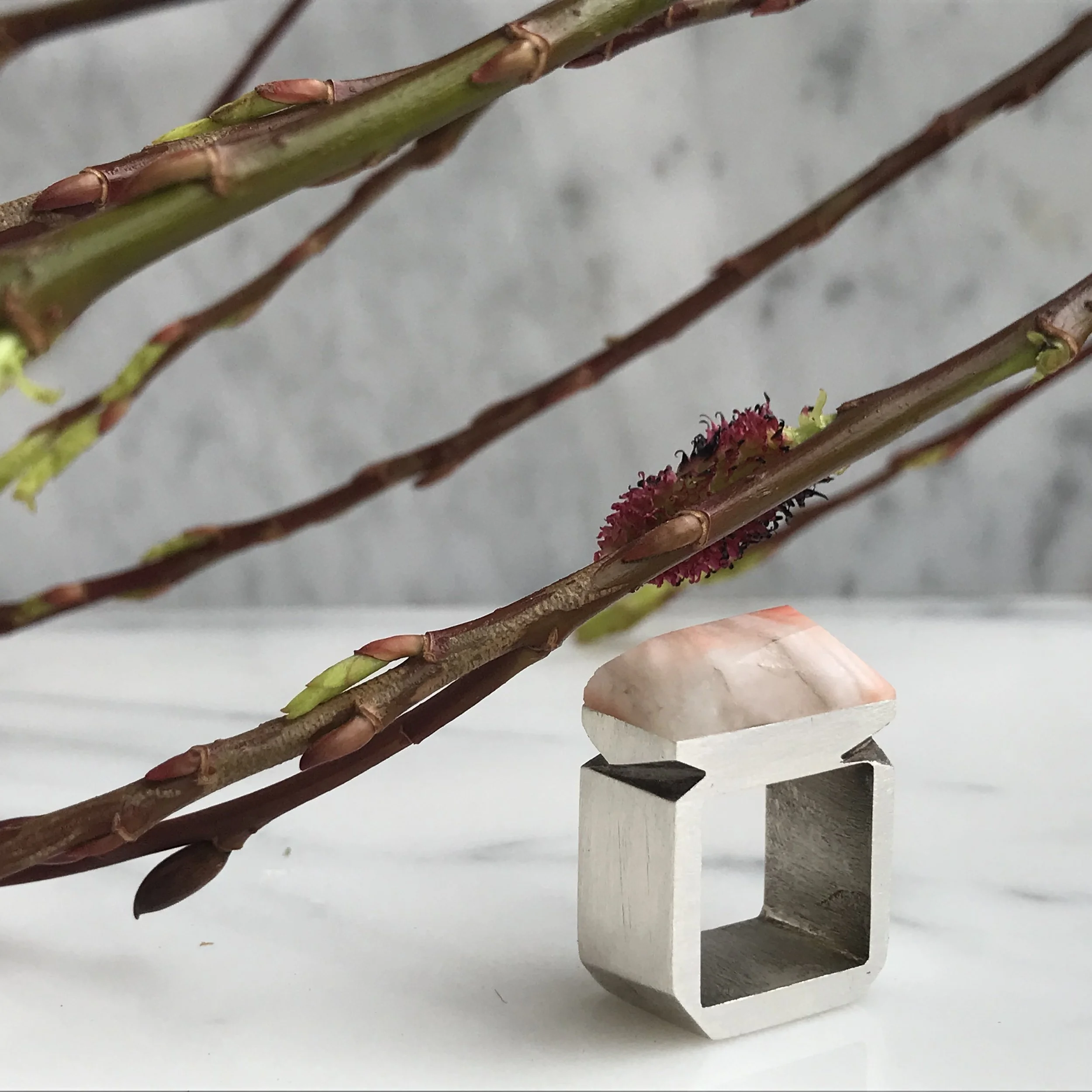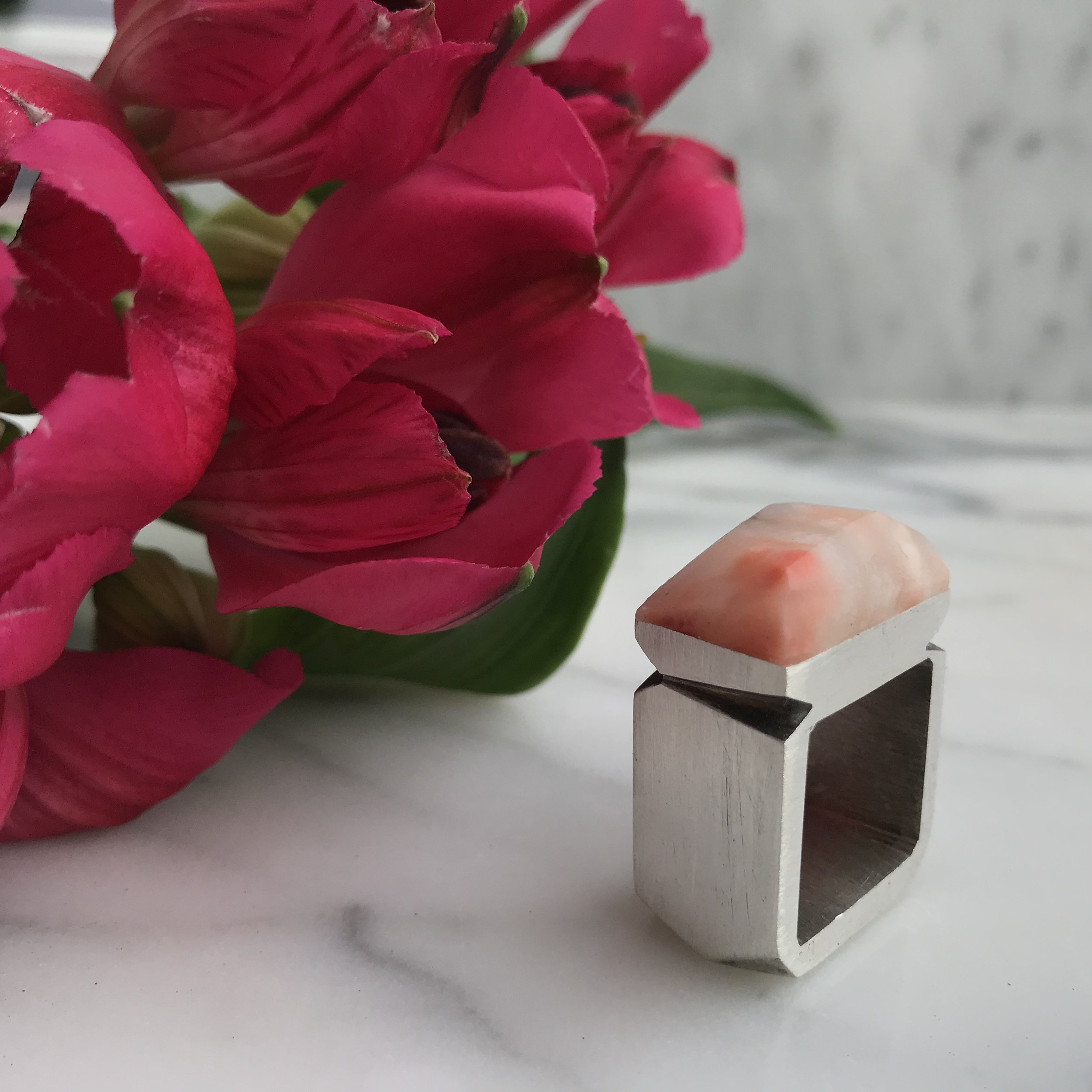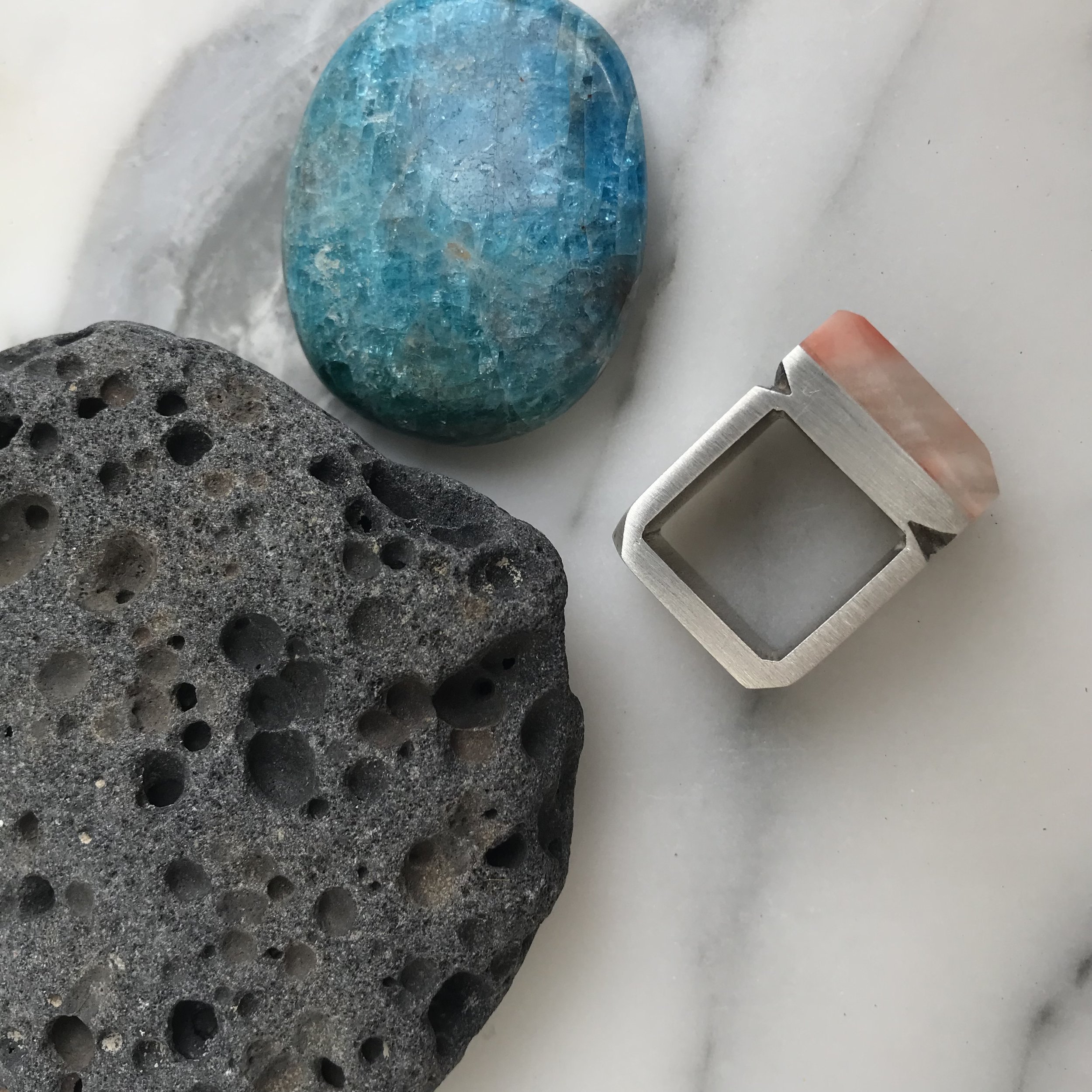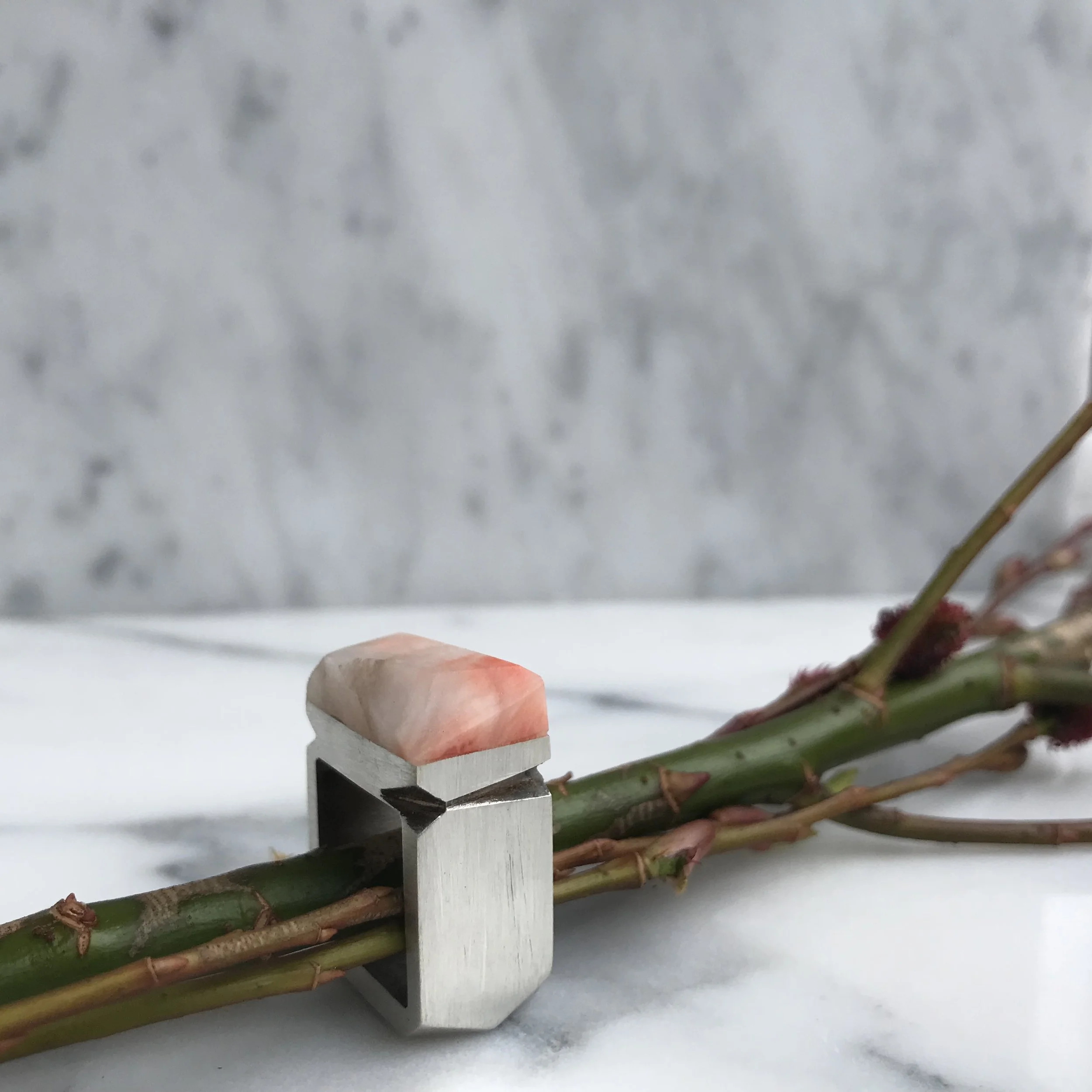 In this new pieces I like to play with the contrast between the strait lines of the cut facets in the stone, with the softer changes in the colors tones, from white to black passing through pink.