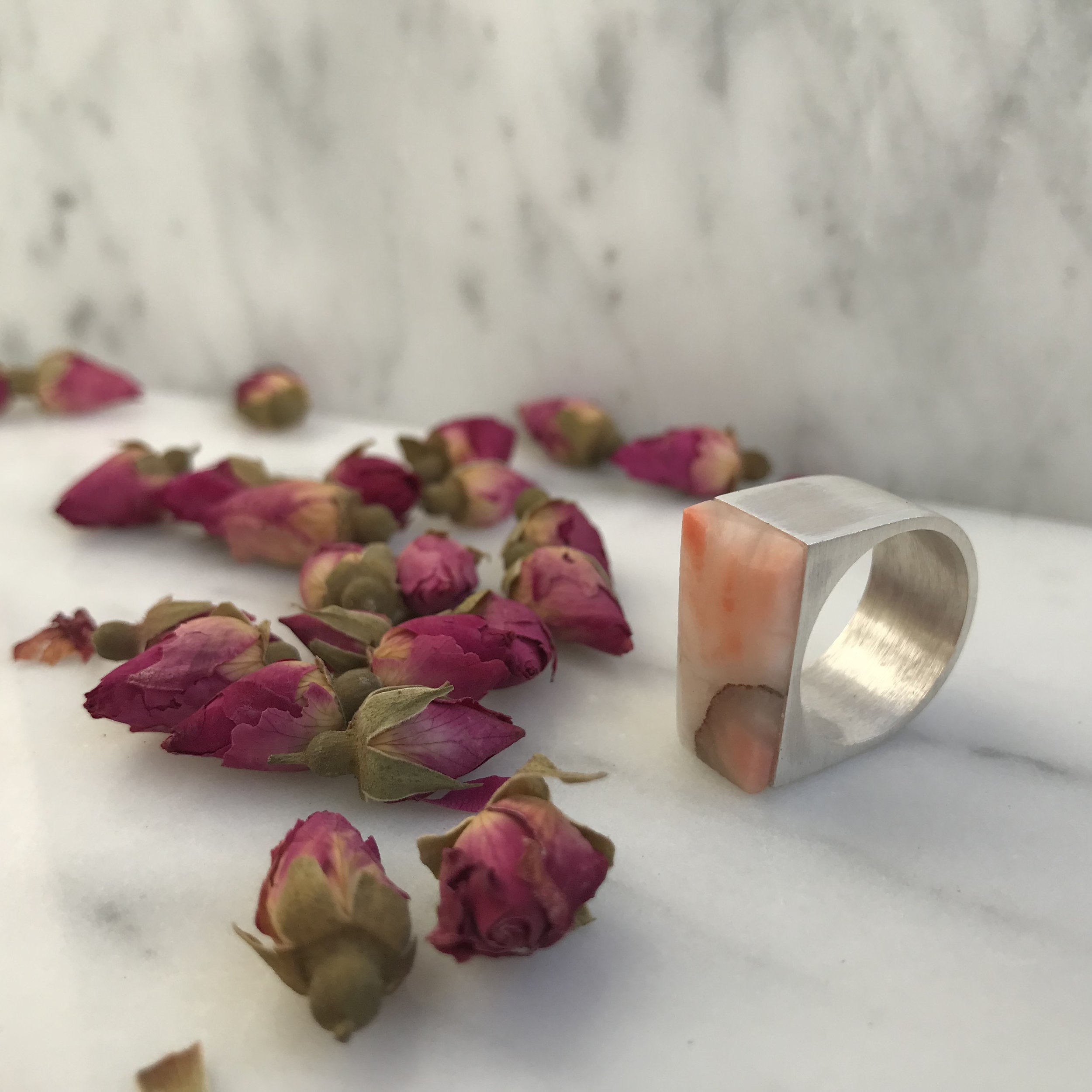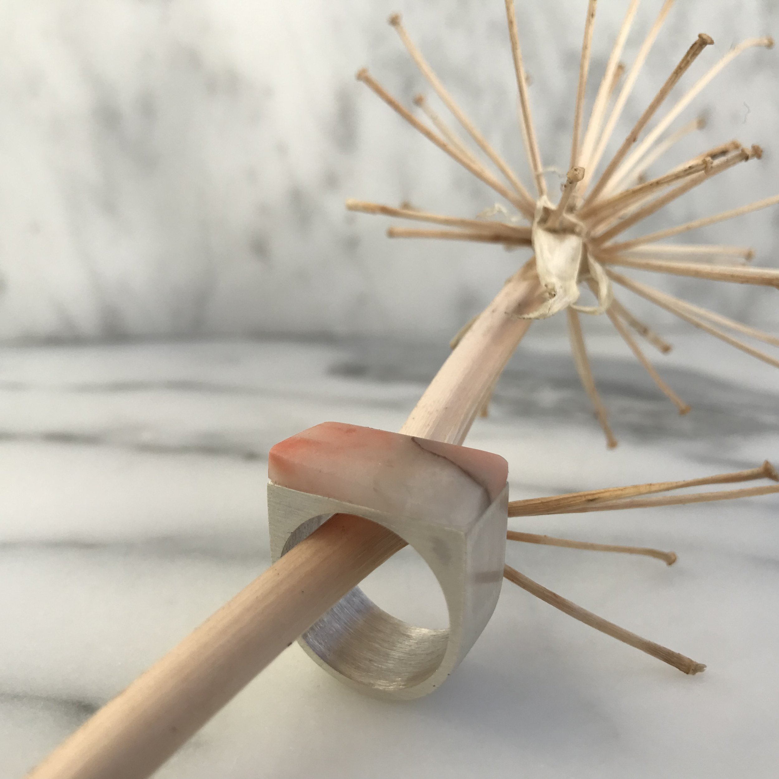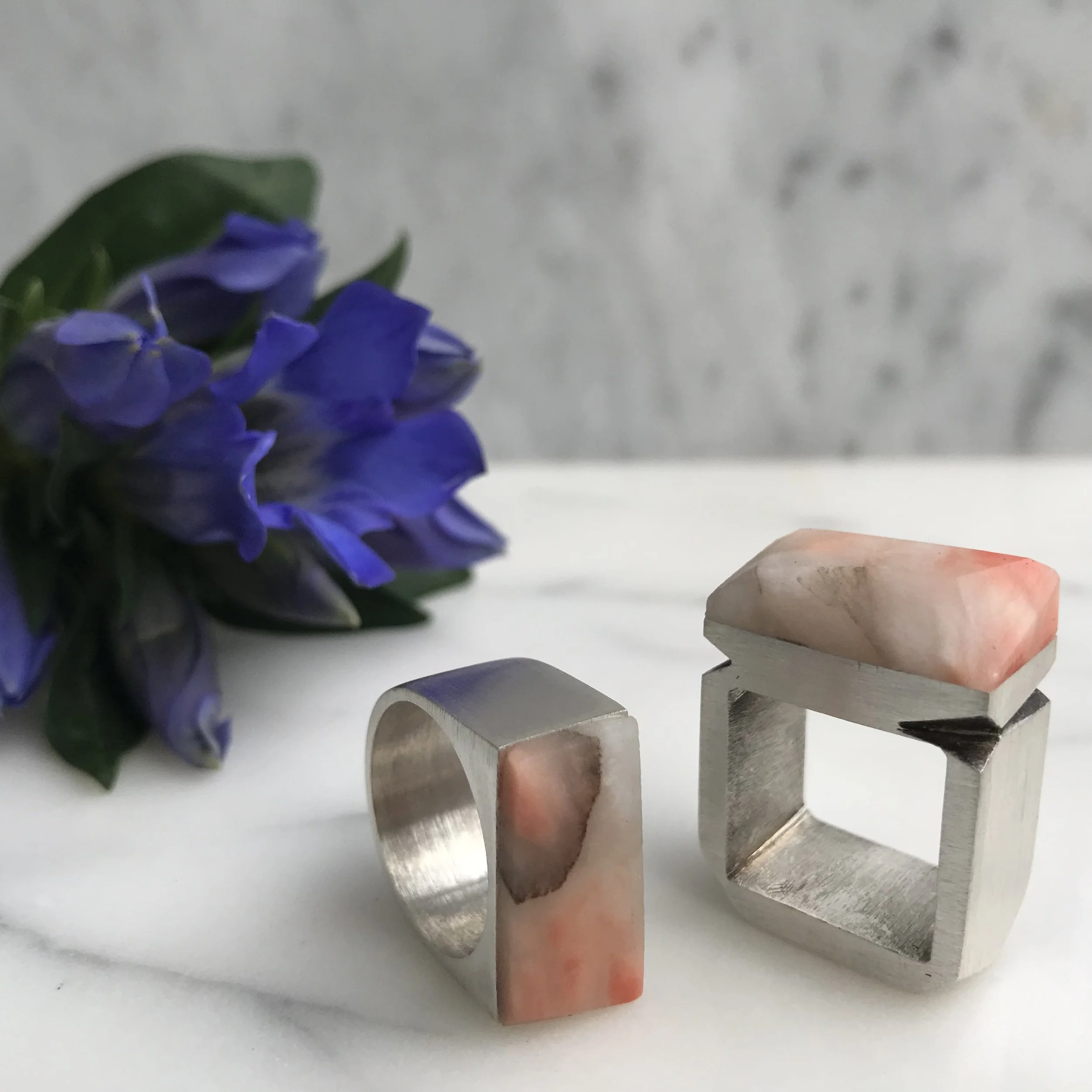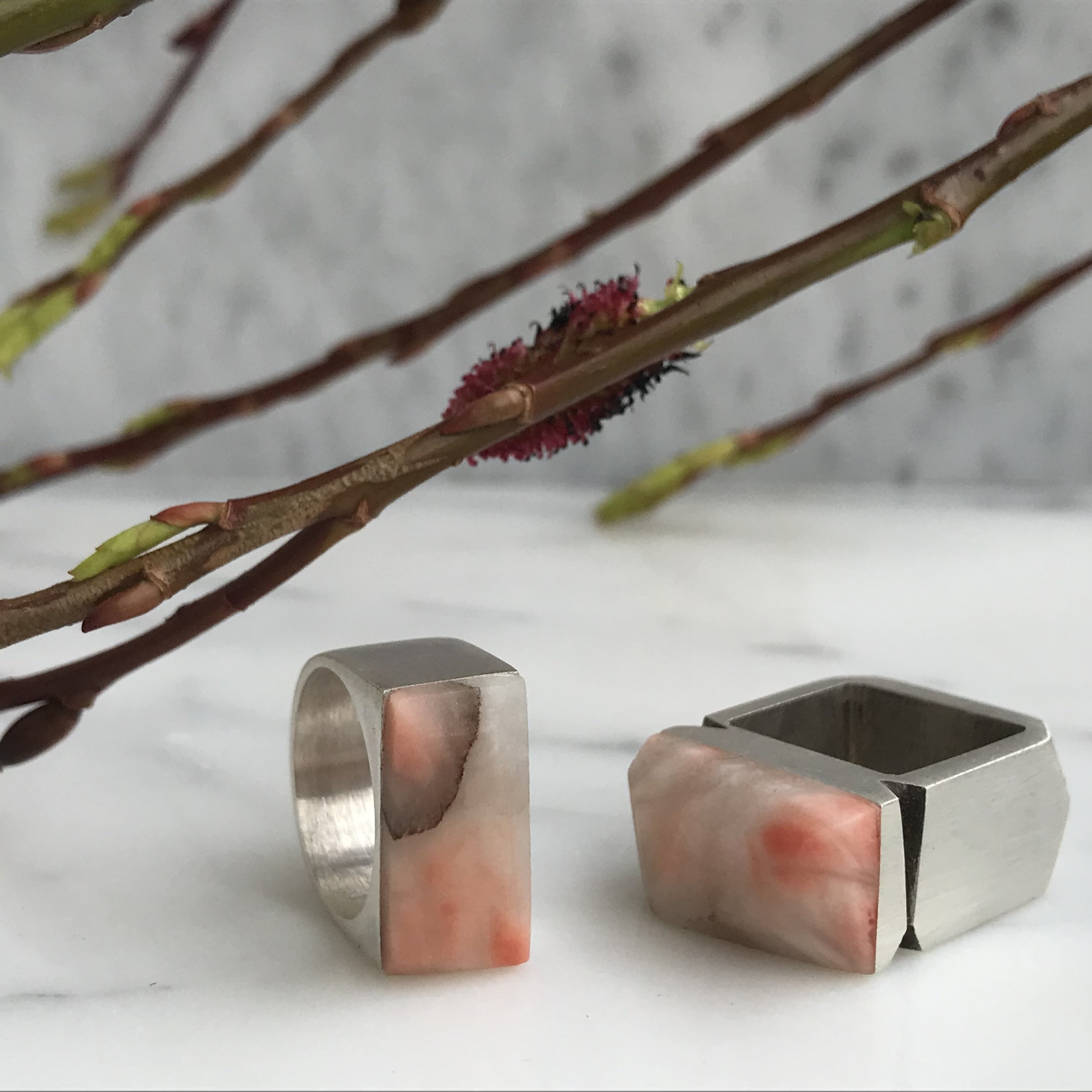 In this new pieces I like to play with the contrast between the strait lines of the cut facets in the stone, with the softer changes in the colors tones, from white to black passing through pink.
